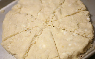 Put the dough on a high-quality baking sheet. Gently push the dough into a flat disk about one inch high. Cut into eight equal pieces and arrange them on the baking sheet about one inch apart. Brush some cream onto the tops of the scones. Bake for 10-12 minutes, or until a toothpick inserted into the middle of one comes out clean.