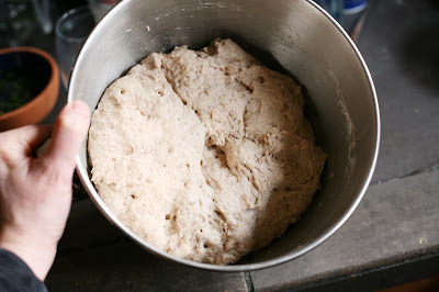 Let the dough rise in a warm place for an hour or two, or until it has almost doubled in bulk and a dent made with your finger stops filling in right away.